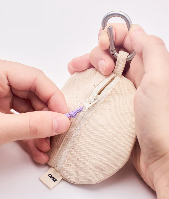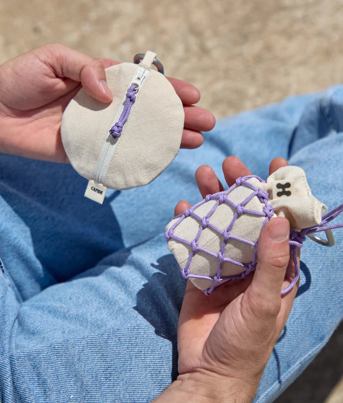 Dog treat bag handmade with OEKO-TEX® certified material and 100% cotton. It is the perfect size to store your AirPods, keys, or your pet’s treats. It features a front zipper and a pull tab that makes closing easy, even when your hands are full. The braid design is inspired by marine fishing nets, paying tribute to the craftsmanship of fishing artisans. The material used is certified for sustainability under GRS, RCS, and OCS standards.